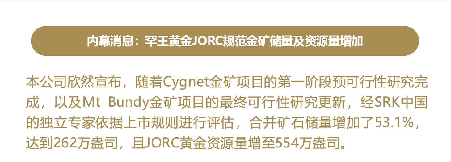 内幕消息:罕王黄金JORC规范金矿储量及资源量增加