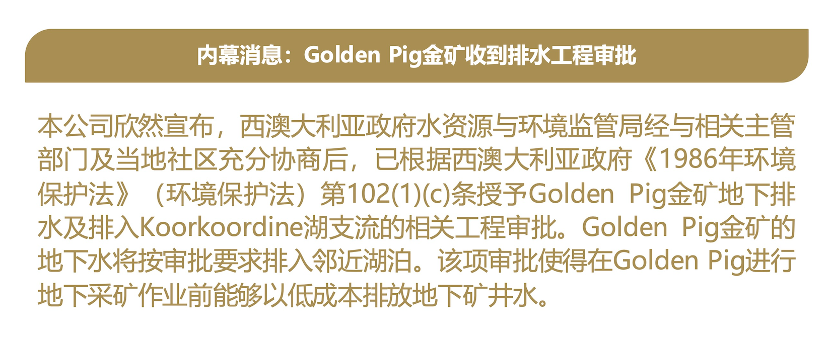 内幕消息:Golden Pig金矿收到排水工程审批